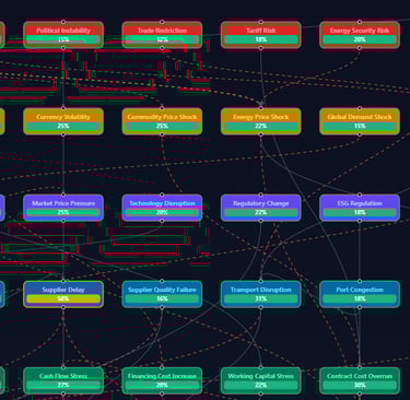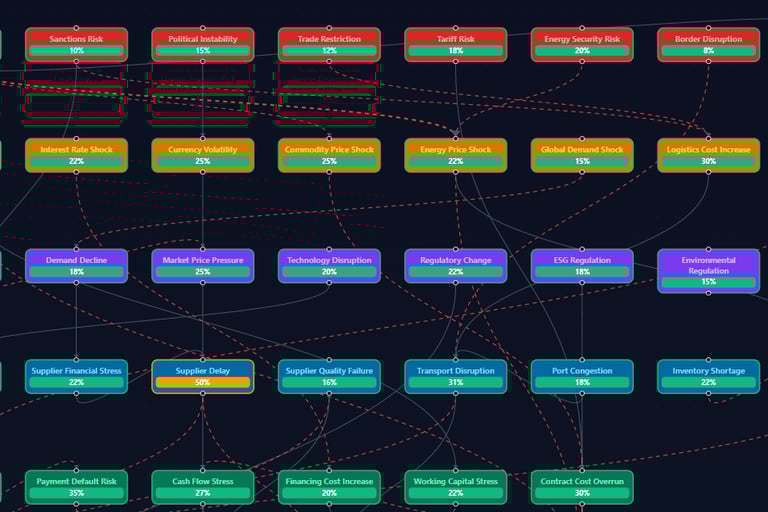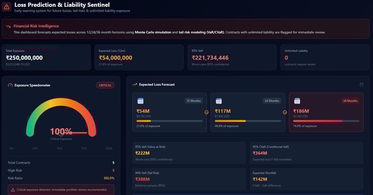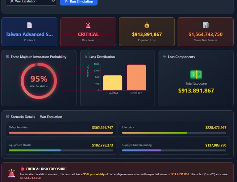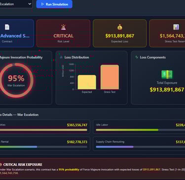 2) Scenario simulator lets you stress-test contracts against events like supply chain collapse, financial crisis, or contract ambiguity.